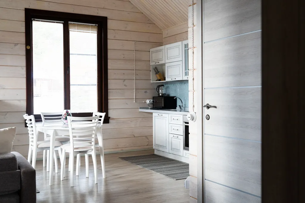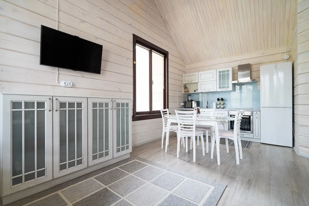 Кухонная зона: холодильником, варочная панель, микроволновая печь, чайник, раковина. Имеется полный комплект посуды. Обеденный стол на 4 персоны.