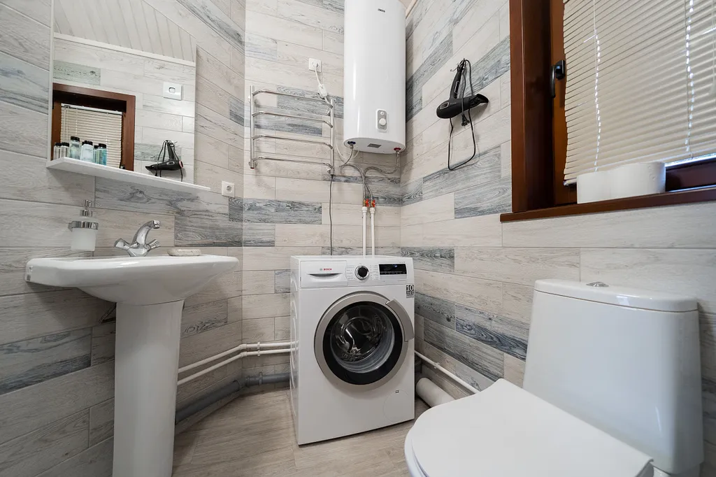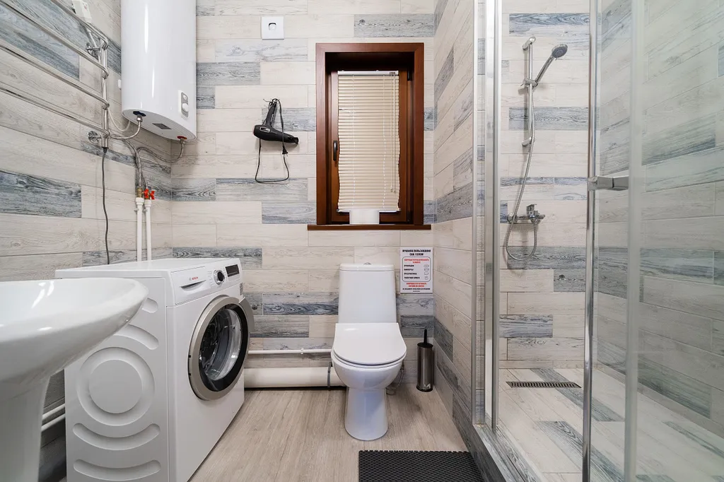 Туалетная комната: WC, просторная душевая кабина, раковина, стиральная машина.